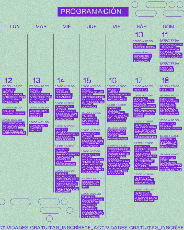 “Como ministerio valoramos el aporte que realiza TTU como una plataforma que hace visible la potencia creativa de Concepción y del Biobío a través de la creación contemporánea desde el territorio y el diálogo con redes internacionales, abriendo espacios de encuentro para públicos diversos. Su programación amplía la mirada sobre lo cotidiano y releva el cruce entre arte, tecnología y comunidad”, indicó Paloma Zúñiga Cerda, seremi de las Culturas, las Artes y el Patrimonio de la Región del Biobío.