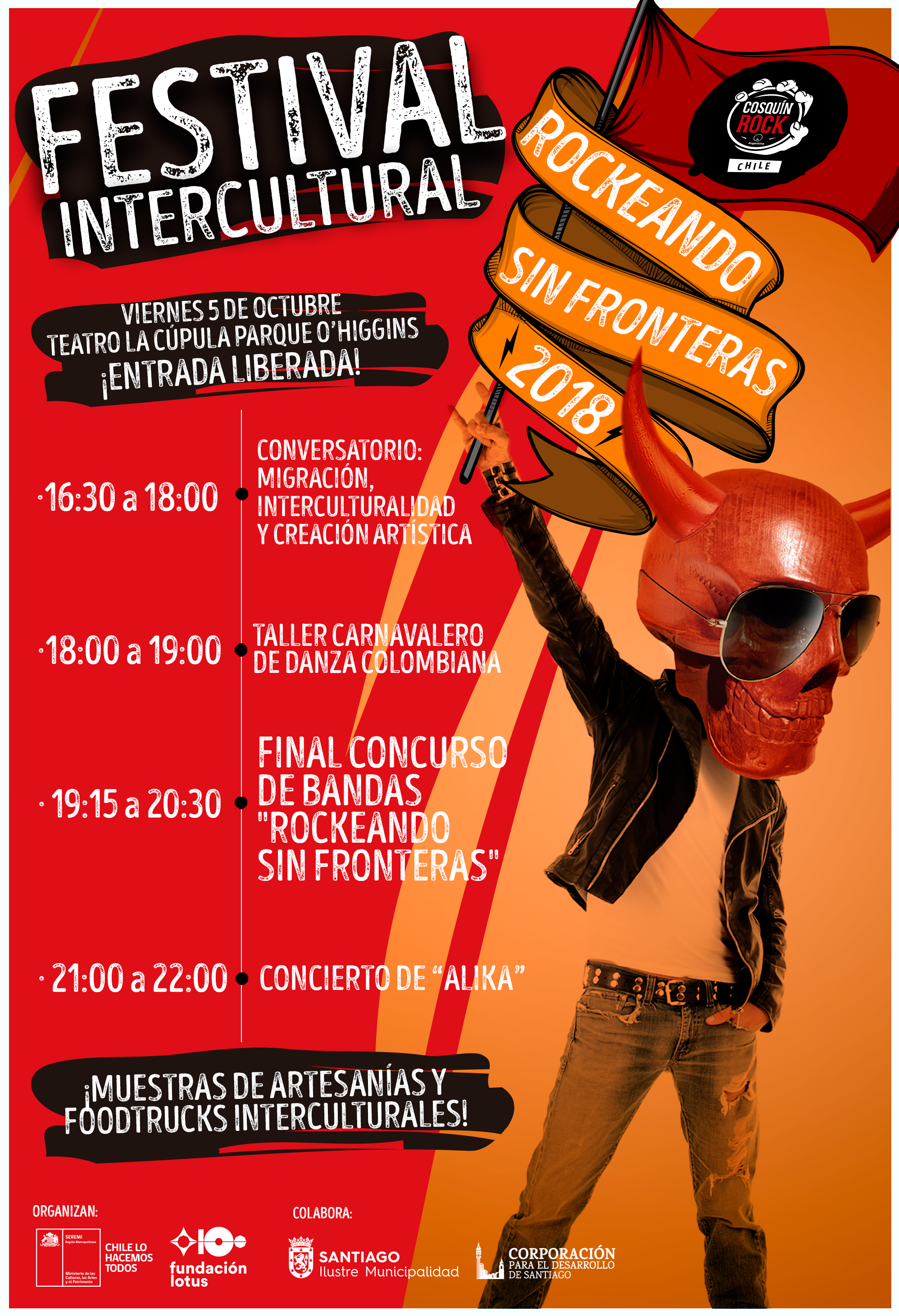 La actividad organizada por la Secretaría Regional Ministerial del Ministerio de las Culturas, las Artes y el Patrimonio de la Región Metropolitana, y la Fundación Lotus, invitó a bandas multiculturales de la región a formar parte del cartel de la primera edición en Chile del reconocido festival de origen argentino, Cosquín Rock, que se realizará entre el 6 y 7 de octubre de 2018.