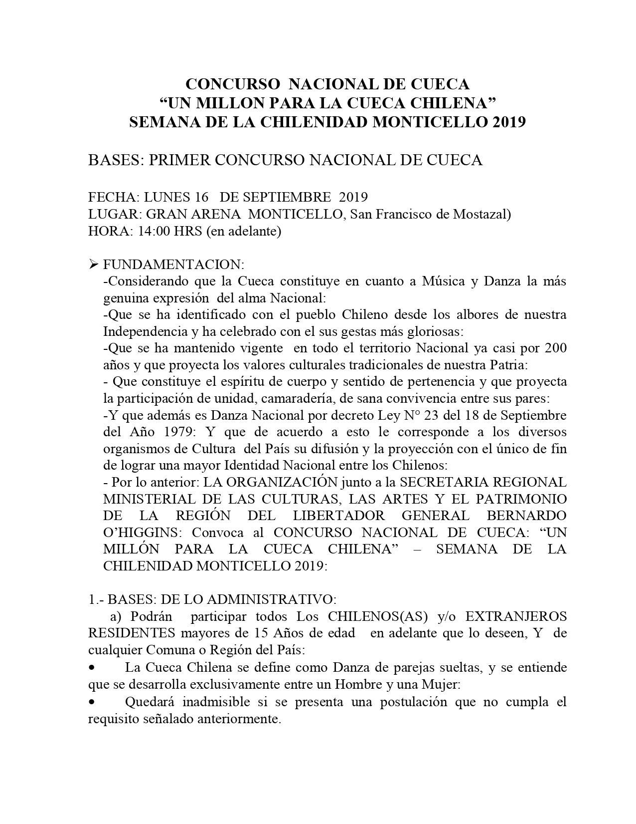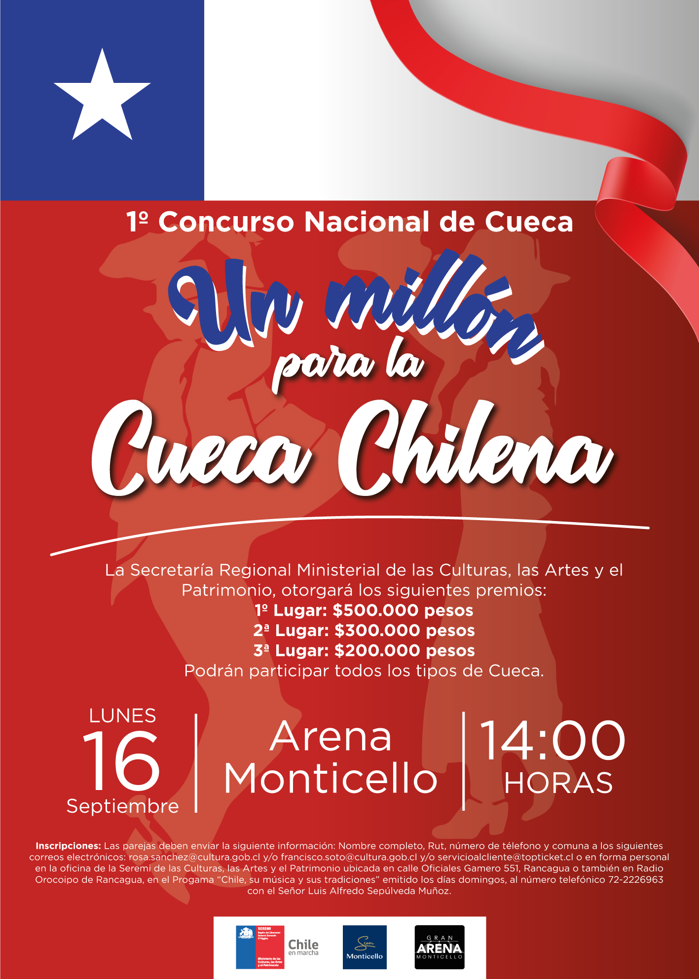Los mejores exponentes de la danza nacional están convocados para el próximo lunes 16 de septiembre, en el Gran Arena Monticello, de San Francisco de Mostazal, donde desde las 14 horas se realizará por primera vez el Concurso Nacional: “Un Millón para la Cueca Chilena”.
