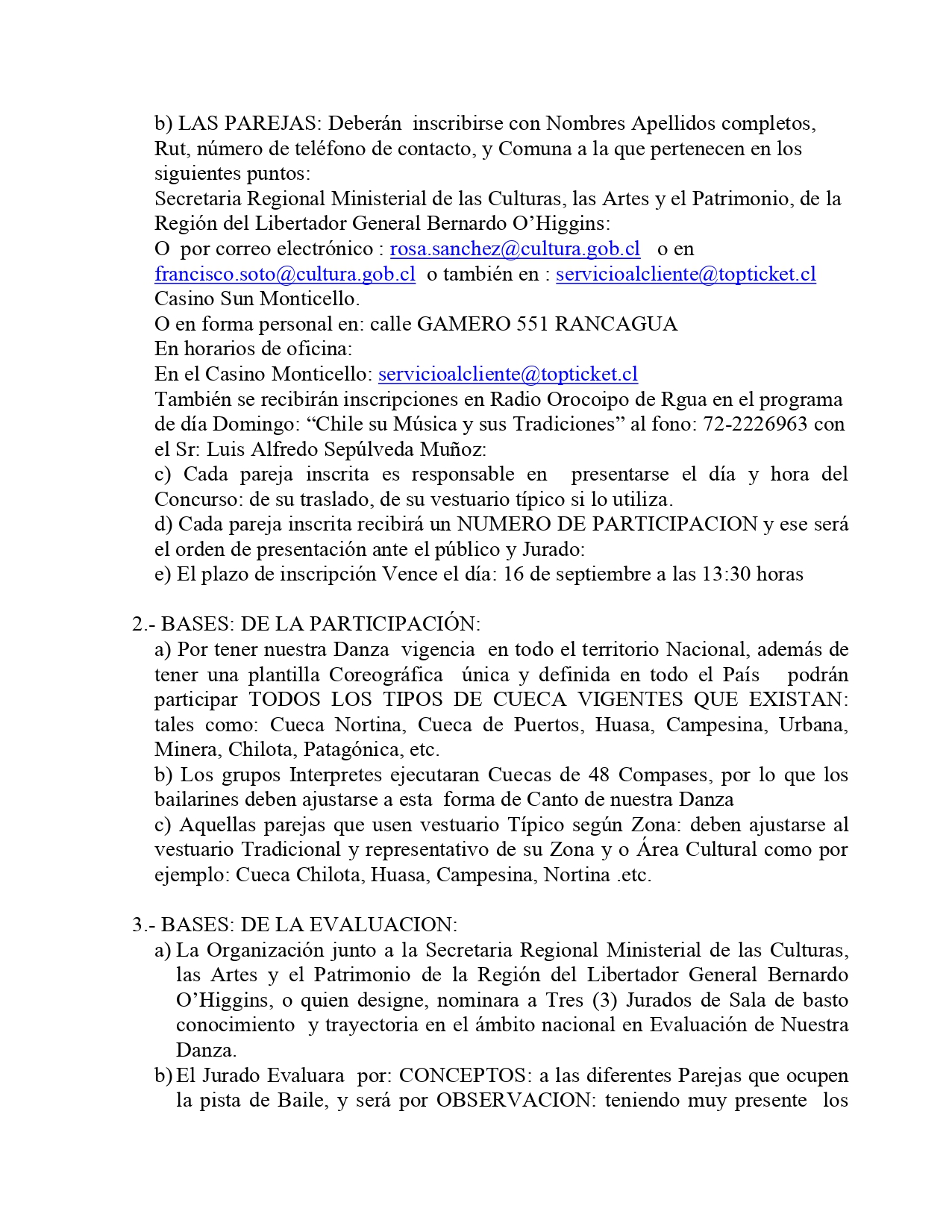 Se trata de una actividad inédita, organizada con la colaboración de la Seremi de las Culturas, las Artes y el Patrimonio de la Región del Libertador General Bernardo O’Higgins, y que buscará elegir a los mejores exponentes de nuestra danza nacional, en la pista de Arena Monticello ese mismo lunes 16.