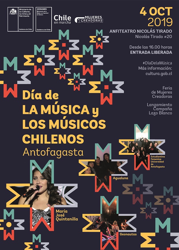 Celebración de carácter ciudadano que este 2019 tendrá lugar en el Parque Nicolás Tirado a partir de las 20 horas, y en donde la presencia femenina será clave, bajo el lema de “Mujeres Creadoras”. Es por ello que el concierto, preparado por la Seremi de las Culturas, contempla en su parrilla a la Estudiantina Femenina de Universidad de Antofagasta, el grupo de creación folclórica Agualuna, el sonido único de Geonauta, y la cantante nacional María Jose Quintanilla, artista encargada de cerrar la velada.