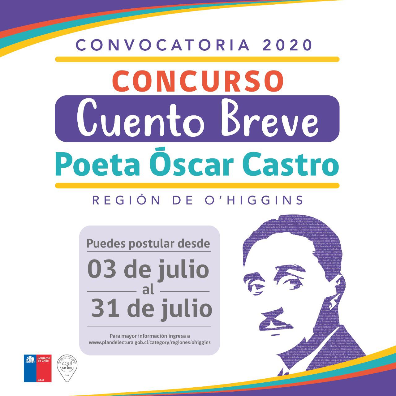 La Secretaría Regional Ministerial de las Culturas, las Artes y el Patrimonio de la Región del Libertador General Bernardo O’Higgins, en el marco del Plan Regional de la Lectura, convoca a participar en el Concurso de cuento breve Poeta Óscar Castro 2020, que tiene por objeto contribuir al fomento lector a través del ejercicio de la escritura creativa.