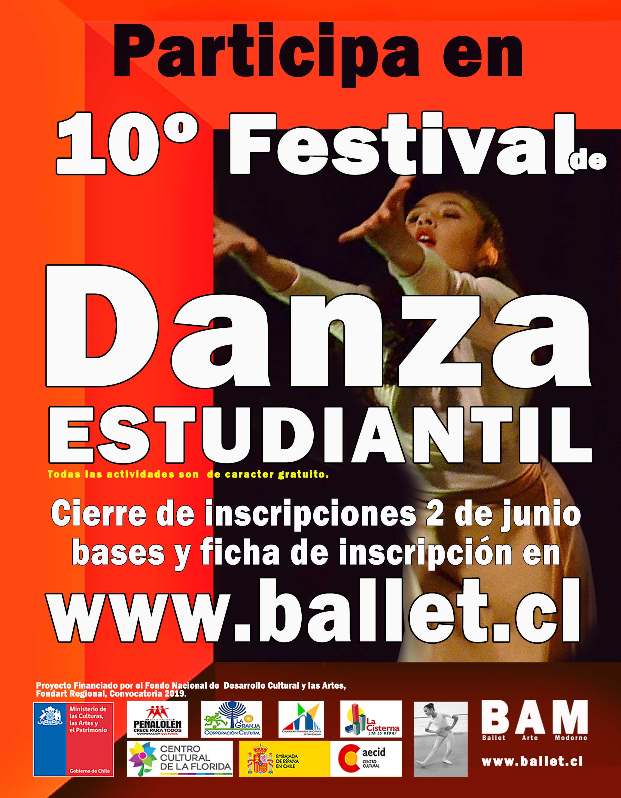 La Corporación Ballet Arte Moderno de Santiago de Chile, tiene el agrado de invitar a los establecimientos educacionales, estudiantes y profesores de la Región Metropolitana, específicamente los cursos de 4° Básico a 4° Medio (ambos inclusive), a inscribir sus obras de danza de cualquier estilo o formato para participar en el “Décimo Festival de Danza Estudiantil Metropolitano 2019”, cuyas bases y ficha de inscripción estarán disponibles hasta el 2 de junio 2019 a las 23:59 hrs.