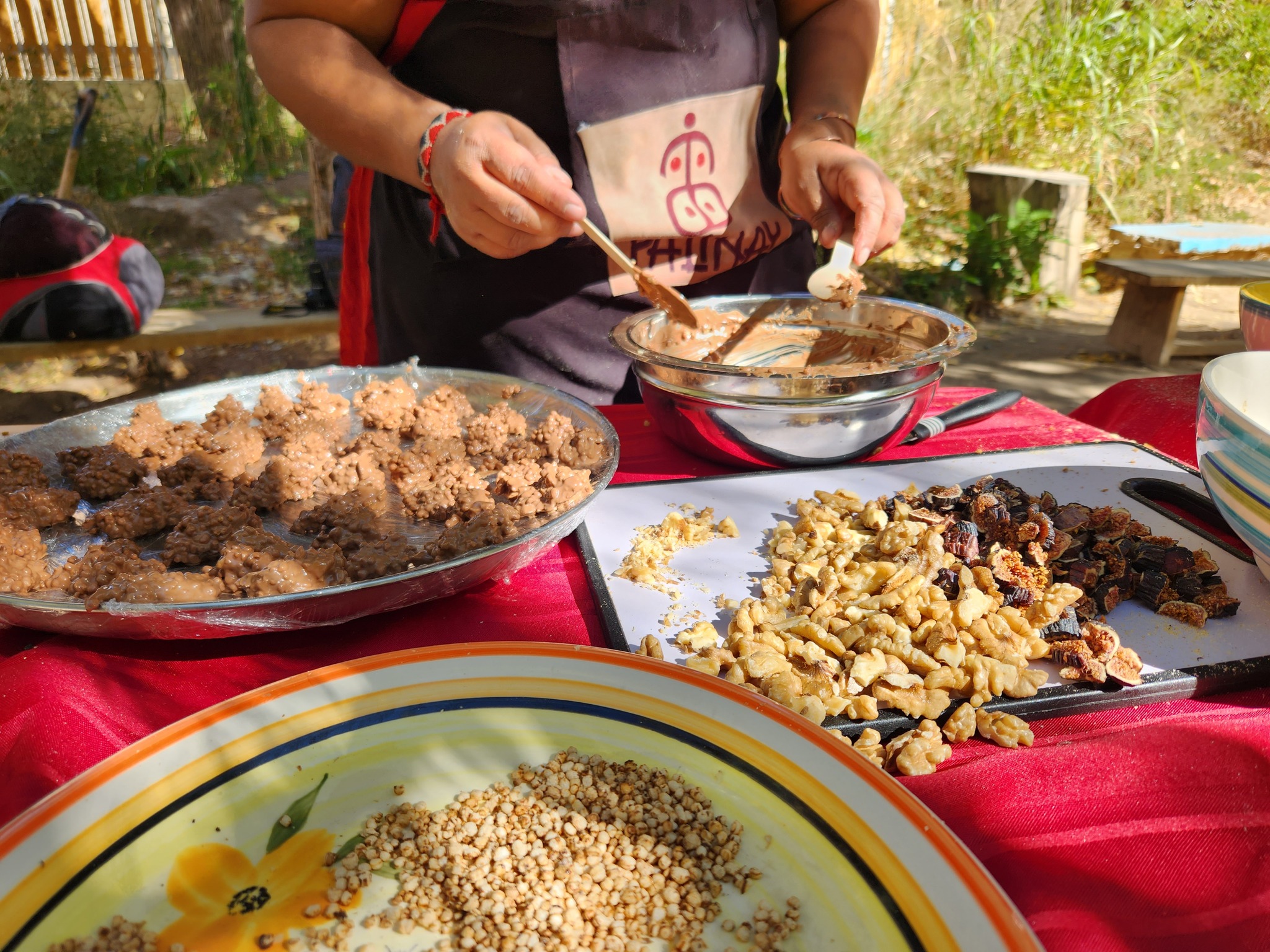 El primero de los talleres se realizó en la escuela de la localidad de La Pampa, “lugar en el que realizamos dulces sanos con bolitas de harina tostada de maíz con arrope, nueces y un toque de patay, que es harina de algarrobo y es parte de nuestros alimentos originarios. Todos los ingredientes son productos que se producen en la comuna y que se consumen habitualmente. Y además hicimos trufas de higos y nueces con quinua inflada con miel, que también se produce en la comuna, y que estaban bañadas con chocolate de leche”, explicó Paula Bórquez.