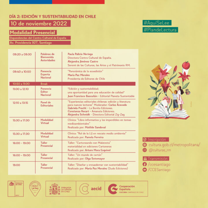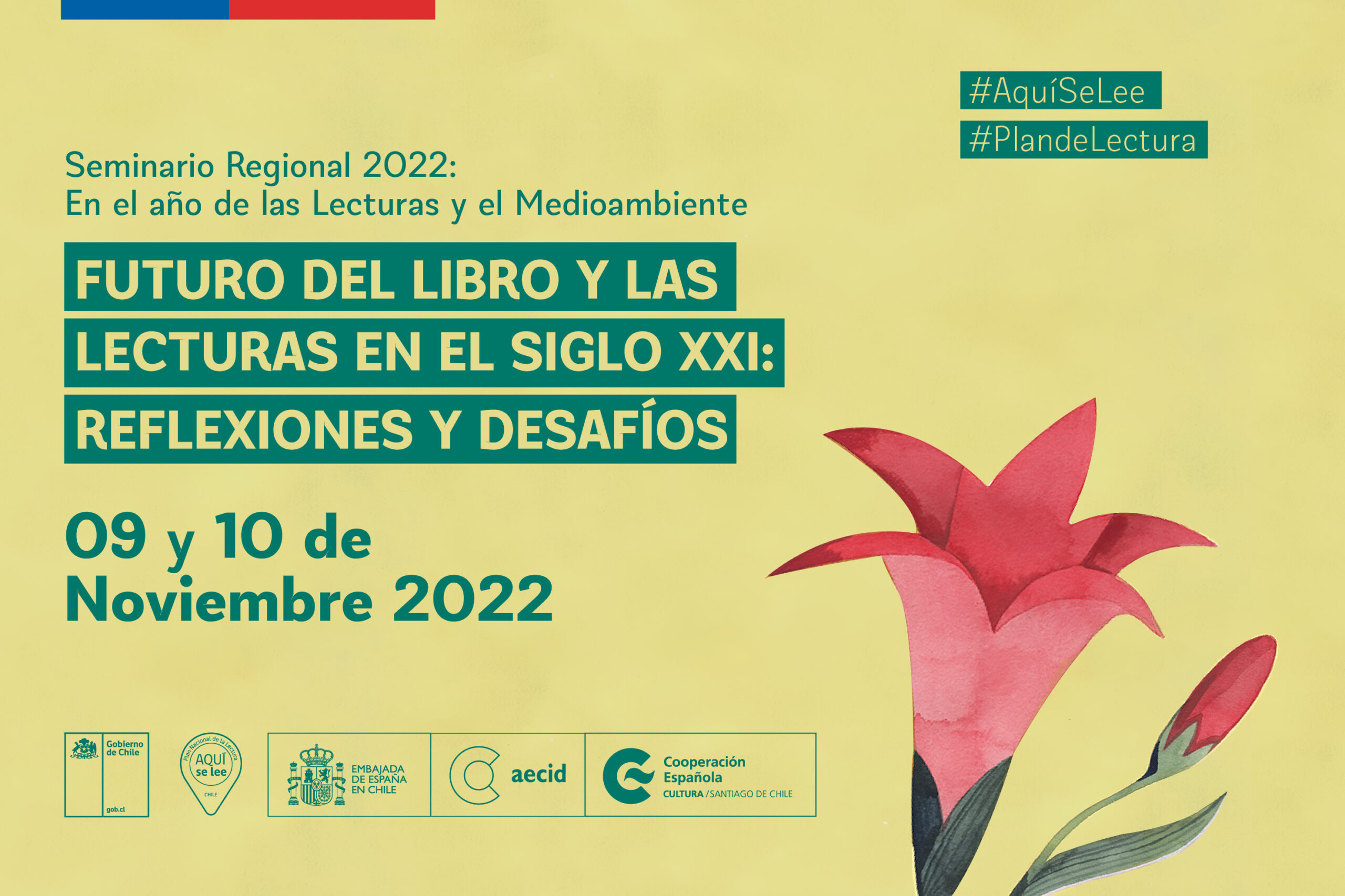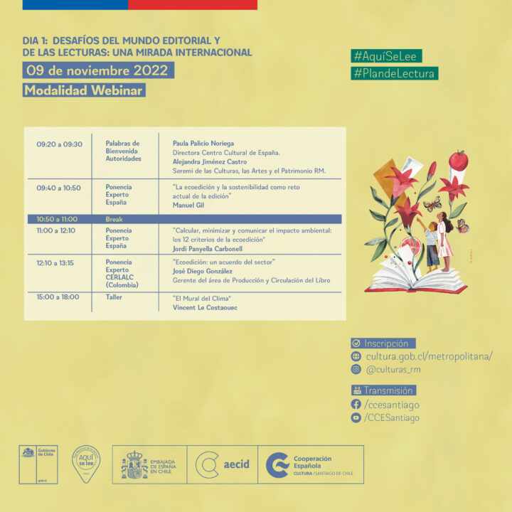 A cargo del Plan de Lectura de la Región Metropolitana, en articulación con el Comité Regional de Lectura, y en colaboración con el Centro Cultural de España AECID Chile, se desarrollará el Seminario Regional 2022, en el año de las Lecturas y el Medioambiente “FUTURO DEL LIBRO Y LAS LECTURAS EN EL SIGLO XXI: REFLEXIONES Y DESAFÍOS” los días 09 y 10 de Noviembre con ponencias, clínicas y talleres online y presenciales que contarán con la presencia de destacados expositores y expositoras de España y Latinoamérica.
