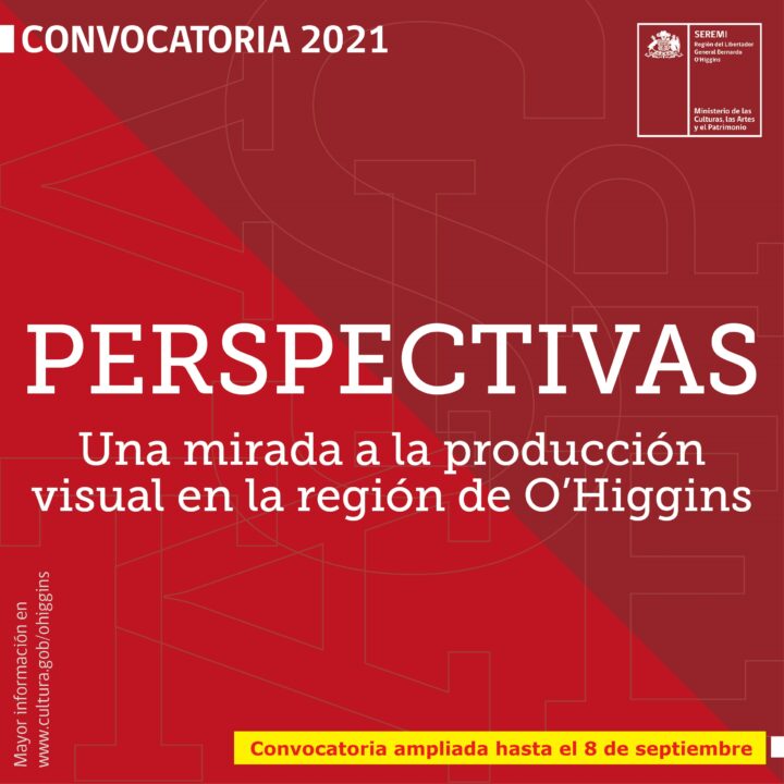 La Seremi de las Culturas, las Artes y el Patrimonio de la Región del Libertador General Bernardo O’Higgins anunció que, debido a múltiples solicitudes recibidas durante los últimos días, se amplió el plazo para postular a la convocatoria “Perspectivas. Una Mirada a la Producción Visual en O’Higgins”. Esta innovadora iniciativa busca generar contenido digital, para así fomentar la creación y promover la diversidad de disciplinas que conforman las Artes de la Visualidad. En tanto que posteriormente se elaborará un catálogo y una exhibición de obras, con el afán de acercar las creaciones artísticas y sus procesos a la ciudadanía y de esta forma exista un acceso libre y gratuito para la ciudadanía.