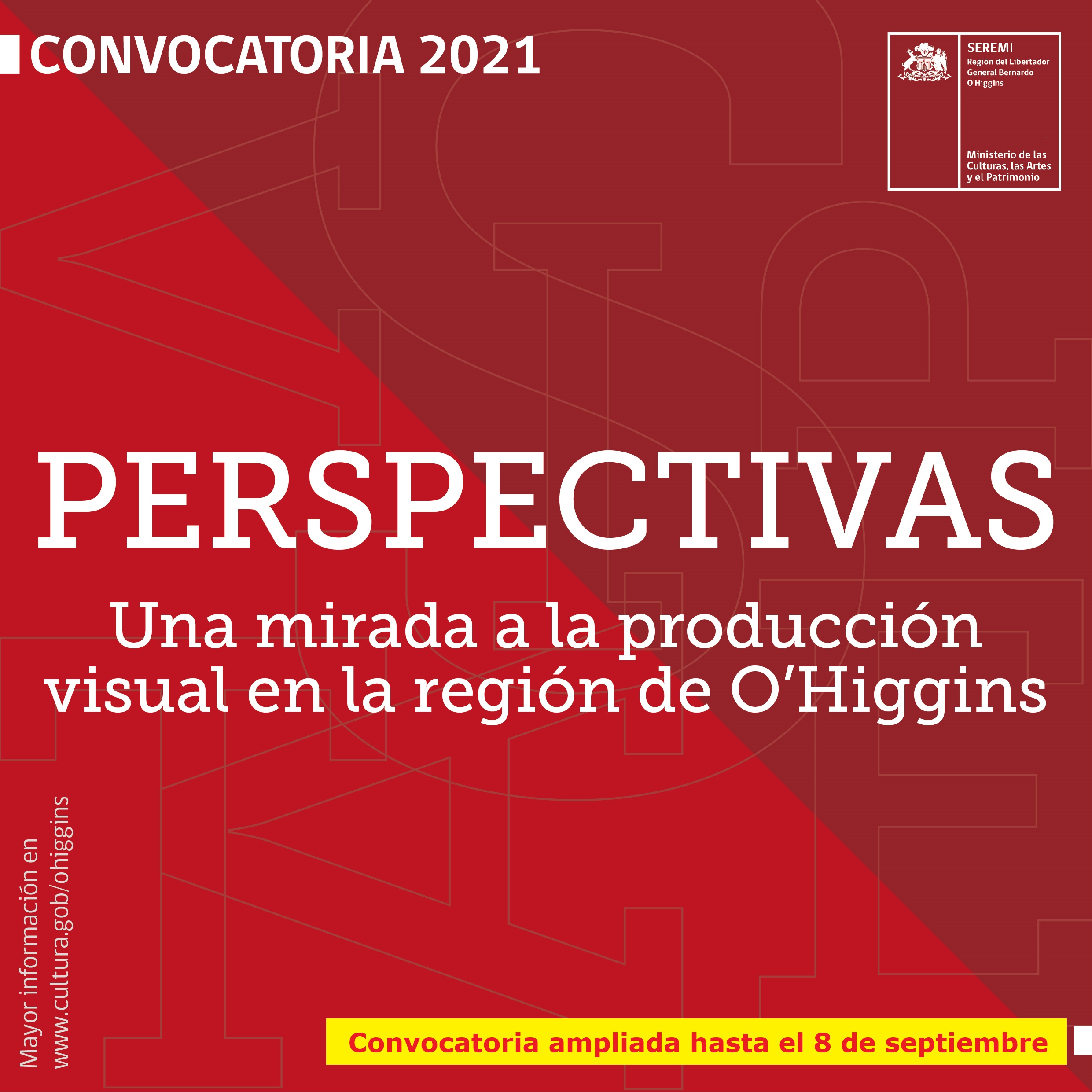 La Seremi de las Culturas, las Artes y el Patrimonio de la Región del Libertador General Bernardo O’Higgins anunció que, debido a múltiples solicitudes recibidas durante los últimos días, se amplió el plazo para postular a la convocatoria “Perspectivas. Una Mirada a la Producción Visual en O’Higgins”. Esta innovadora iniciativa busca generar contenido digital, para así fomentar la creación y promover la diversidad de disciplinas que conforman las Artes de la Visualidad. En tanto que posteriormente se elaborará un catálogo y una exhibición de obras, con el afán de acercar las creaciones artísticas y sus procesos a la ciudadanía y de esta forma exista un acceso libre y gratuito para la ciudadanía.