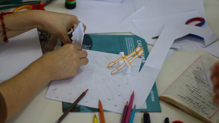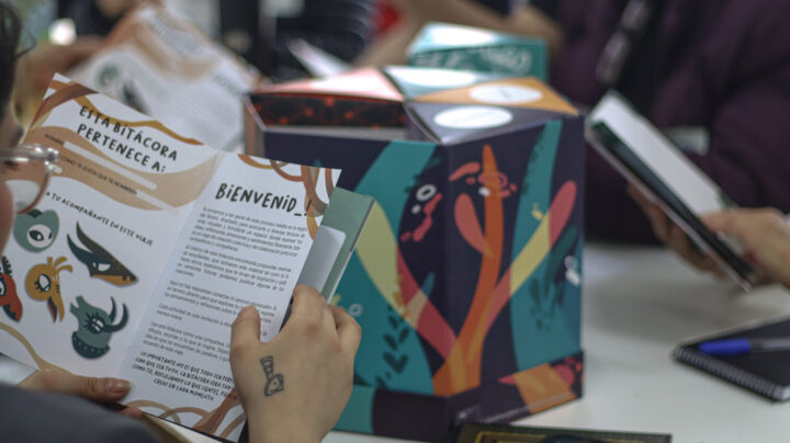 En la jornada de la tarde se realizó la mediación para el uso de la Caja Caleidoscópica, junto a los artistas mediadores Daniela Guerrero González, Claudia Urbina y Paulo Arias Ruiz, quienes guiaron los procesos de activación y diálogo de este material didáctico especialmente diseñado para trabajar con adolescentes e inspirado en la obra de artistas visuales locales. Este dispositivo, desarrollado por la Mesa de Educación Artística de la provincia de Concepción con apoyo del Programa Red Cultura Biobío, el Programa Fortalecimiento de la Identidad Cultural Regional (FICR) y el Plan Regional de Artes de la Visualidad Biobío, invita a “pensar con las manos” y a promover aprendizajes colectivos a partir de temáticas como territorio, cuerpo, juventudes y ciudadanía.