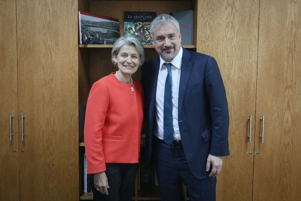 En una fluida conversación, que da seguimiento a las reuniones que el ministro Ottone tuvo con los directores de patrimonio material e inmaterial de la Unesco en París en mayo pasado, la Directora General expresó su reconocimiento al Secretario de Estado chileno por el avance del proyecto de ley que crea el Ministerio de las Culturas, las Artes y el Patrimonio, e indicó que es un importante avance en la estructura organizacional de las instituciones que velan por el patrimonio, las culturas y las artes.