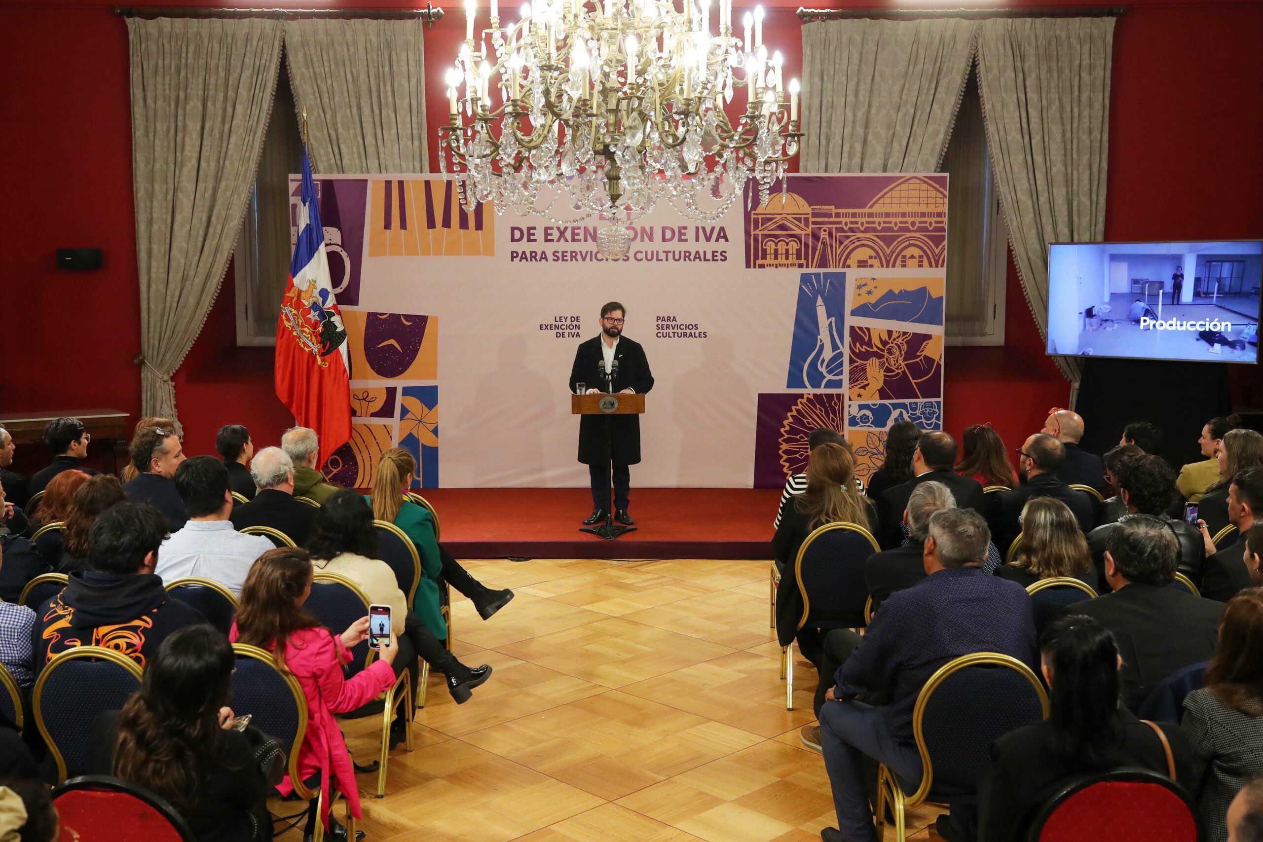 En compañía de actores y músicos nacionales, el Presidente de la República Gabriel Boric Font, junto a la ministra de las Culturas, las Artes y el Patrimonio, Carolina Arredondo Marzán, promulgaron esta mañana en La Moneda la Ley de exención del IVA para Servicios Culturales.