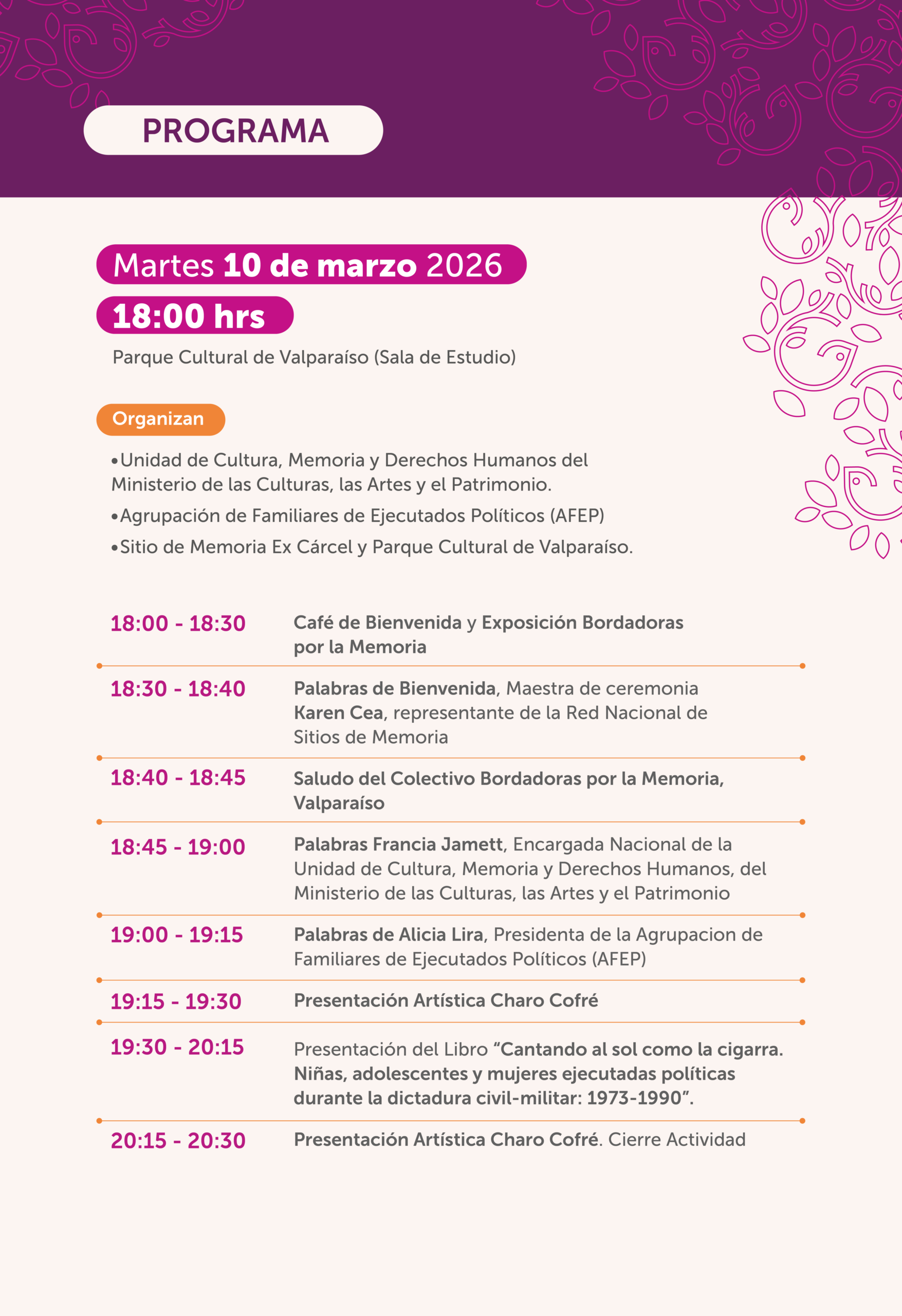 La presentación del libro estará a cargo de la abogada Karinna Fernández, especialista en Derechos Humanos; Claudio Nash Rojas, coordinador académico de la Cátedra de Derechos Humanos de la Universidad de Chile; y Francia Jamett Pizarro, encargada de la Unidad de Cultura, Memoria y Derechos Humanos. El lanzamiento también contará con una presentación artística de la destacada cantora, Charo Cofré, y una exposición del Colectivo Bordadoras por la Memoria de Valparaíso.