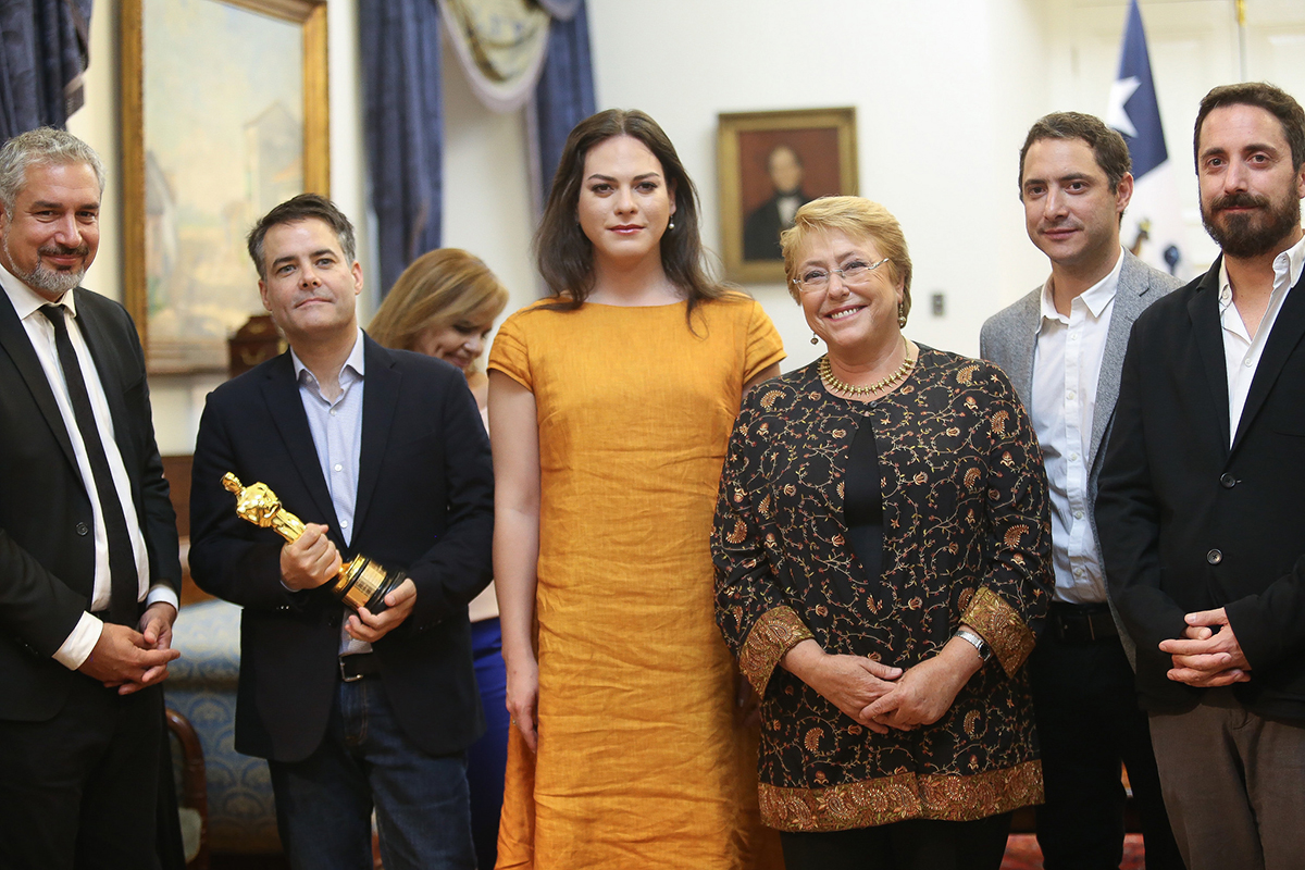 Tras su ingreso al Salón de Audiencias del Palacio de La Moneda, la Jefa de Estado conversó distendidamente con los ganadores del Oscar a mejor película en lengua extranjera, entre quienes estaban también los productores Juan de Dios Larraín, Pablo Larraín, Martín Cárcamo, Eduardo Castro, Soledad Salfate, Muriel Parra y Estefanía Larraín; además del guionista Gonzalo Maza.