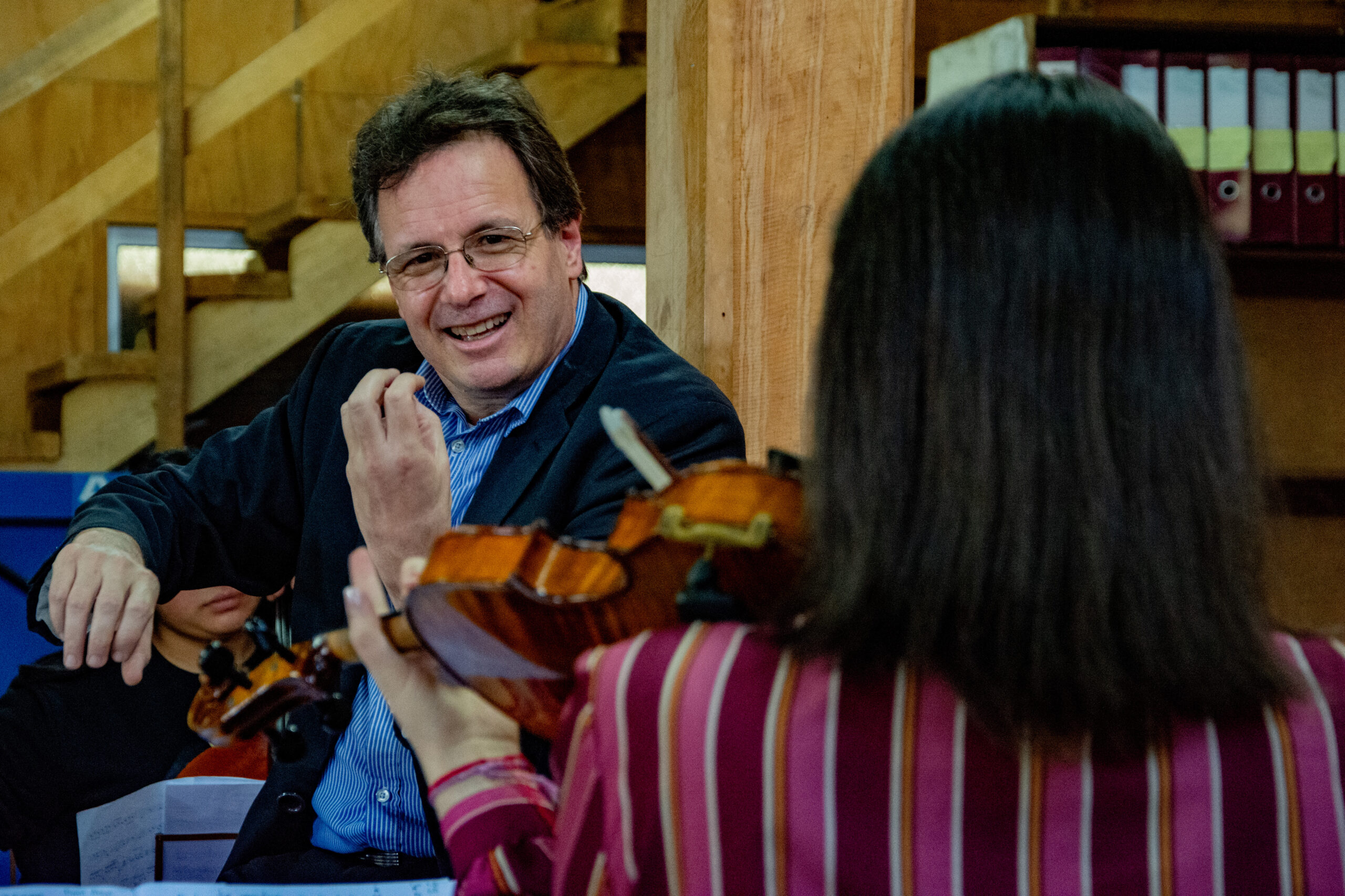 En Achao, Marco Fernández (violín) y Walter Jiménez (corno), realizaron talleres a niñas y niños del Liceo Bicentenario Insular y escuela Básica de Achao, en la comuna de Quinchao, quienes previa a la presentación se acercaron a conversar con todo el elenco y conocer los instrumentos.