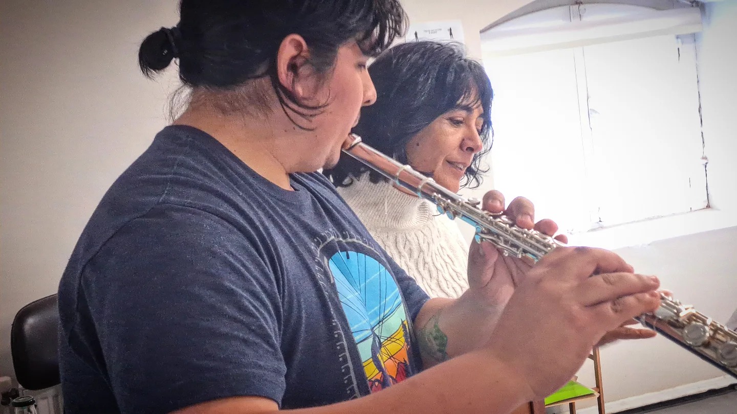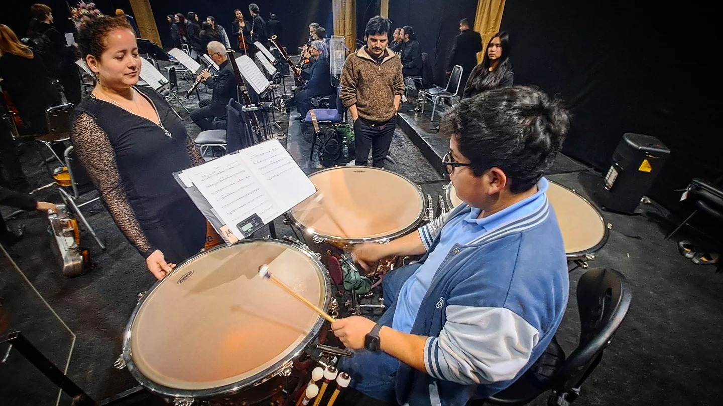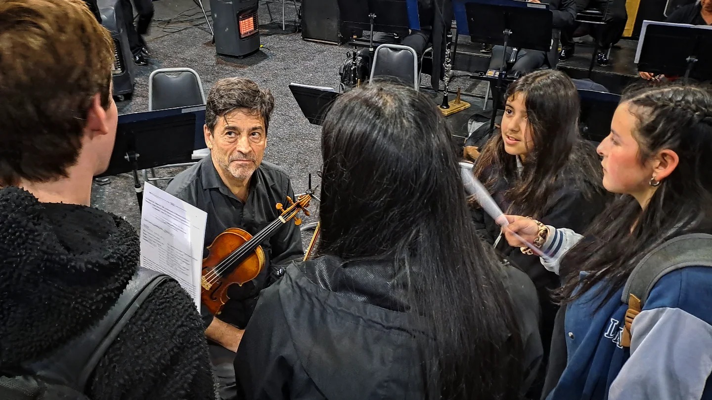 En Panguipulli, la flautista Javiera Bustos siguió de cerca la presentación de la orquesta en el Teatro Educativo de las Artes, con la que compartirá escenario en abril del próximo año, tras haber ganado el Concurso José Chacana para Jóvenes Solistas, que organizó la OCCh este 2024. “Es un honor conocerlos a todos. Estoy muy emocionada, mucho más ahora que los vi por primera vez en vivo. Estoy esperando con ansias el 4 de abril, en que vamos a tocar todos. La verdad, es un trabajo impresionante, es una orquesta muy bacán”, dijo Javiera tras conocer al director Siffert y a los músicos del elenco.