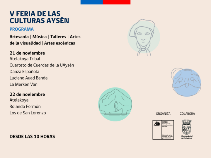 La quinta edición de la Feria de Culturas Aysén contempla talleres, mediaciones artísticas, espacios de formación, números musicales y dancísticos, conversatorios y más de 70 estands con creaciones y productos de primera calidad desde diversos y distantes puntos del país. Puedes visitarla hasta el viernes desde las 10 de la mañana y revisar la programación en www.cultura.gob.cl/aysen.