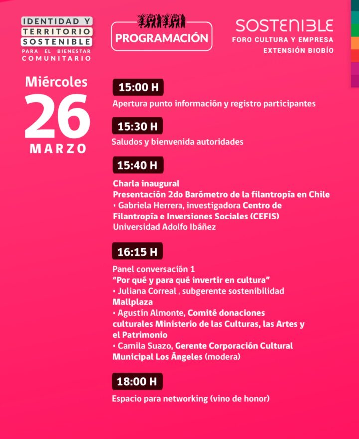 La jornada inaugural, el miércoles 26 de marzo, incluirá la presentación del Segundo Barómetro de la Filantropía en Chile, a cargo de Gabriela Herrera, investigadora del CEFIS de la Universidad Adolfo Ibáñez. Luego se realizará el panel «Por qué y para qué invertir en cultura», con exposiciones de Juliana Correal (Mallplaza), Agustín Almonte (Ministerio de las Culturas) y Camila Suazo (Corporación Cultural Municipal de Los Ángeles), quien además moderará la conversación. La jornada cerrará con un espacio para crear redes y fomentar alianzas estratégicas.