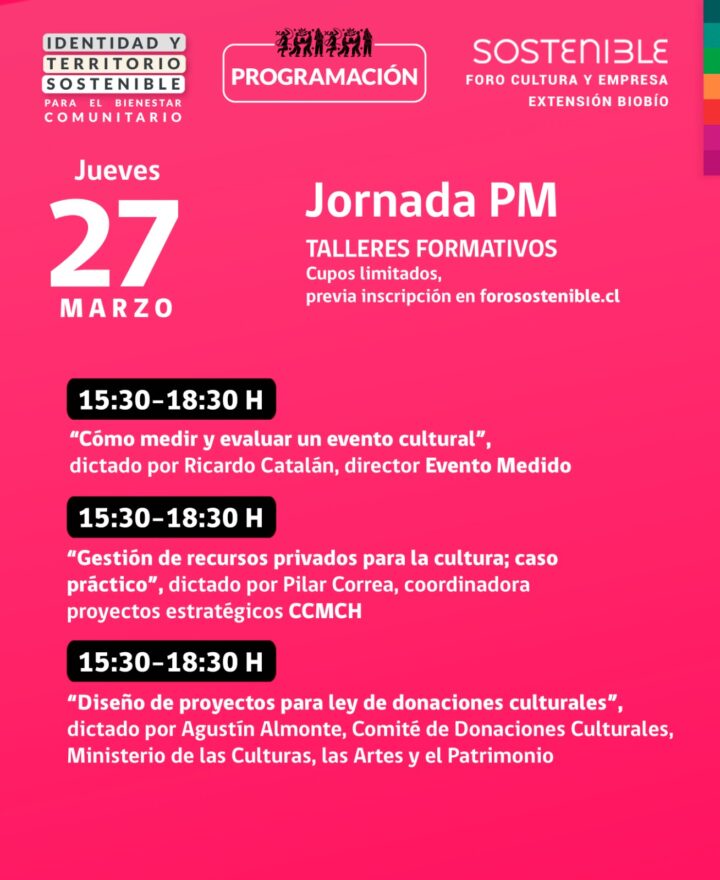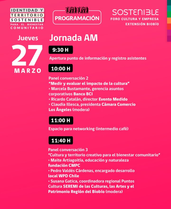 En tanto, la jornada del jueves 27 comenzará con el panel «Medir y evaluar el impacto de la cultura», con la participación de Marcela Bustamante (Banco BCI), Ricardo Catalán (Evento Medido) y Claudia Illesca (Cámara de Comercio de Los Ángeles). A continuación, se desarrollará el panel «Cultura y territorio creativo para el bienestar comunitario», donde expondrán Maite Artiagoitía (Fundación CMPC), Pedro Valdés (WPD Chile) y Susana Gatica (SEREMI de las Culturas del Biobío).