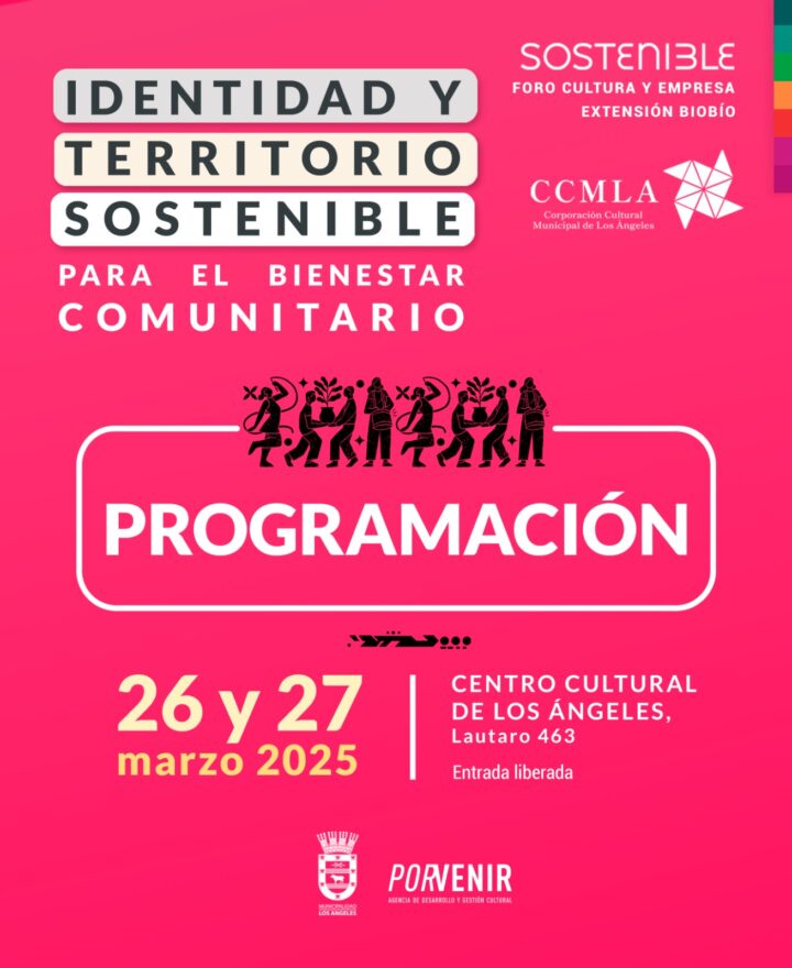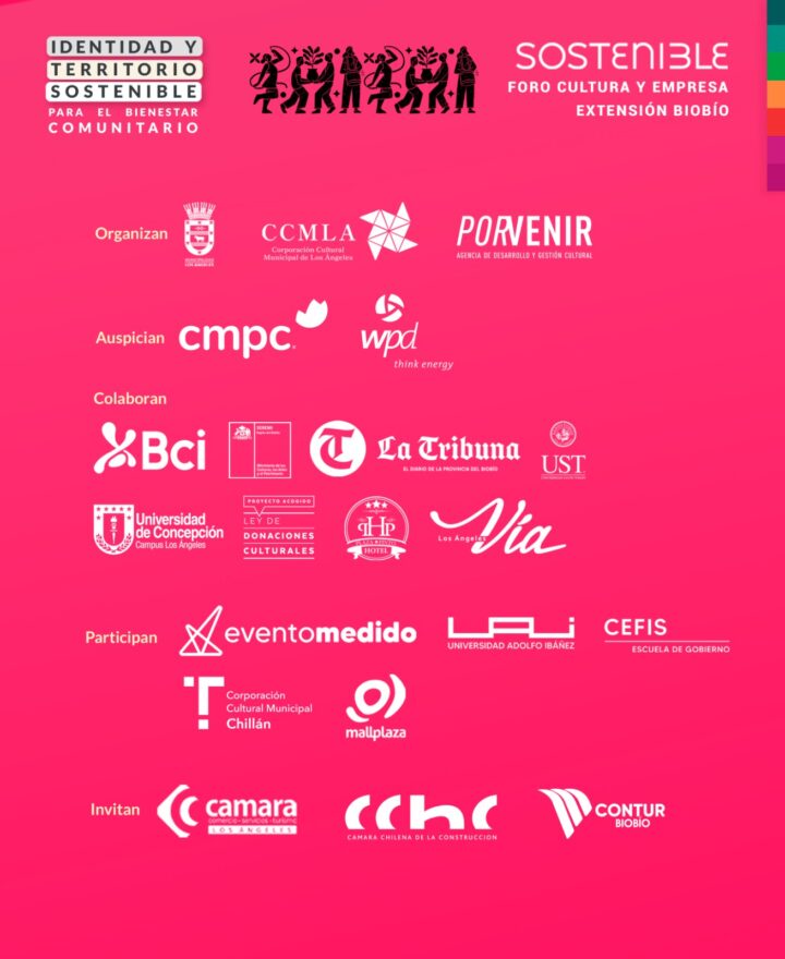 Bajo el lema “Identidad y territorio sostenible para el bienestar comunitario”, el Foro pondrá en valor el rol de la cultura en el desarrollo de las comunidades, destacando la identidad como un eje de encuentro entre empresas y organizaciones culturales. La iniciativa es organizada por la Ilustre Municipalidad de Los Ángeles, la Corporación Cultural Municipal de Los Ángeles y la Agencia de Desarrollo y Gestión Cultural Porvenir, con el apoyo de la Seremi de las Culturas, las Artes y el Patrimonio de la Región del Biobío a través del programa Red Cultura. También cuenta con el patrocinio de CMPC y WPD Chile como empresas auspiciadoras.