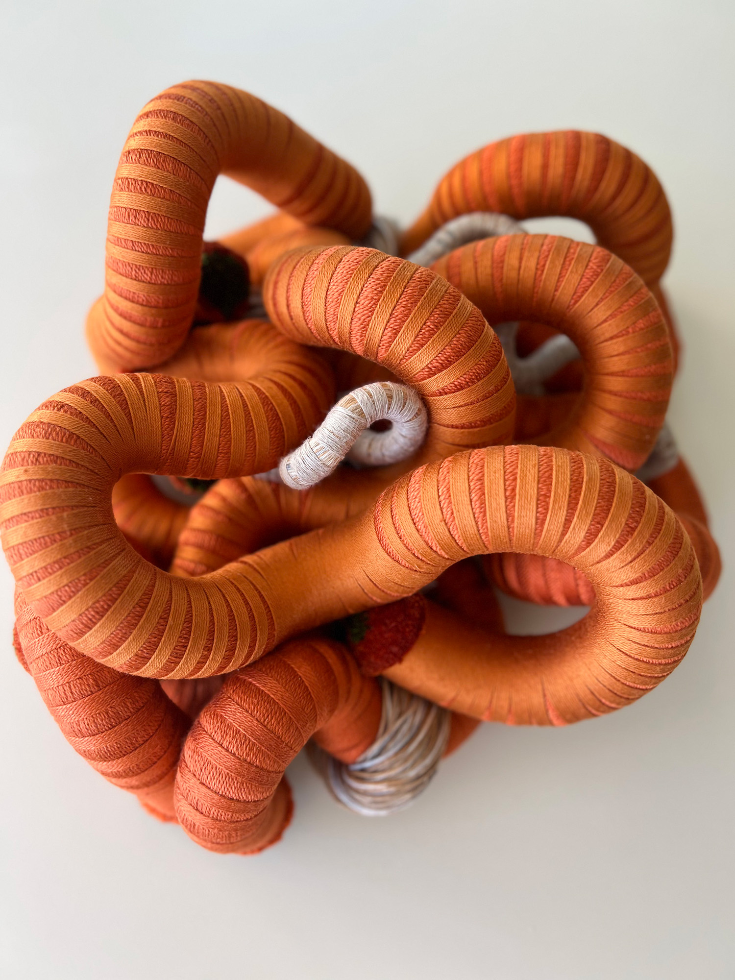Arquitecta y artista argentina radicada en Chile, fusiona lo artesanal con lo industrial en su obra, creando esculturas textiles a partir de hilos, cuerdas, cordones y cuero.